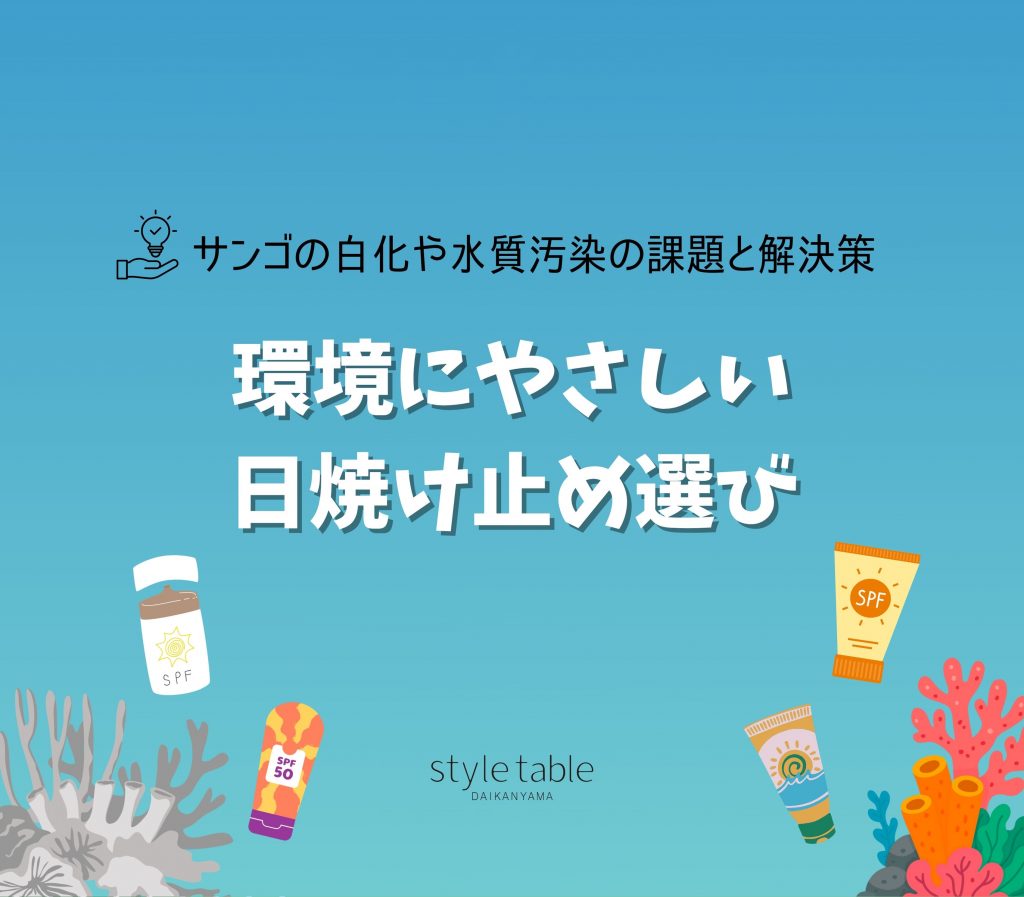 style table(スタイルテーブル)では、エシカルでサスティナブルな商品を通じて、自分と周りと地球に優しい選択をサポートしています。環境に配慮した日焼け止めをはじめ、オーガニックやプラスチックフリーにこだわった商品を豊富に取り揃えておりますので、ぜひ店舗やオンラインストアでご覧ください。あなたの小さな選択が、美しいサンゴ礁を守る大きな力となります。