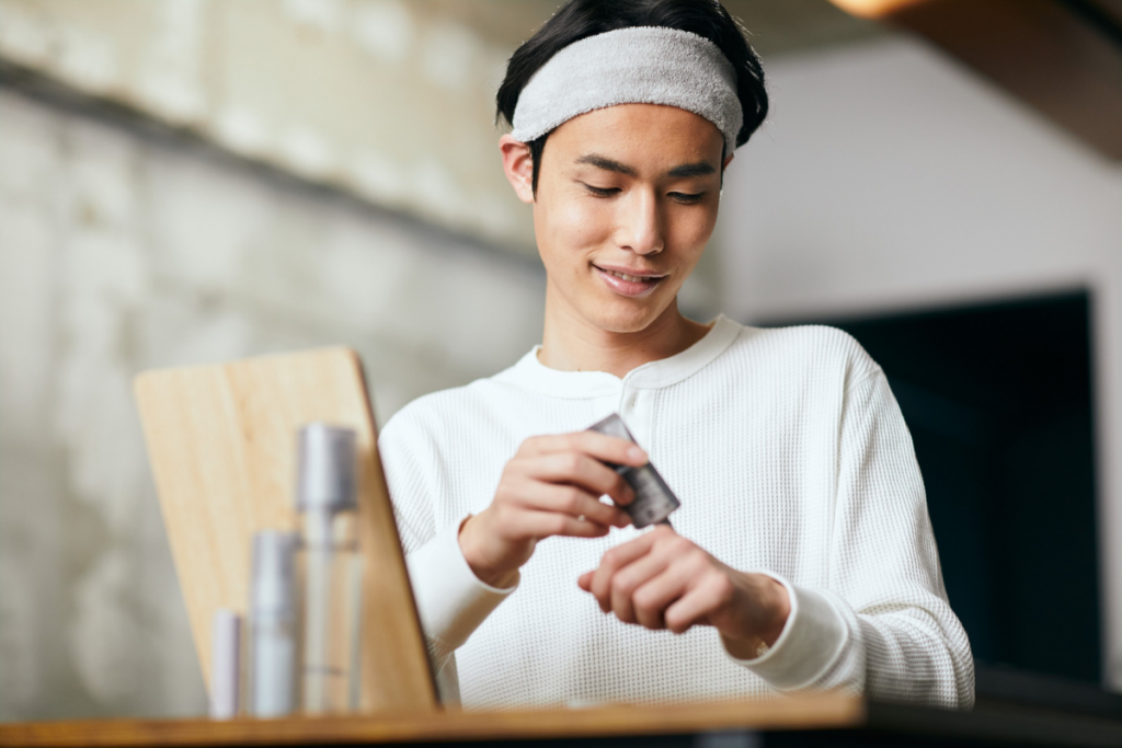 化粧水の後は、乳液やクリームで水分の蒸発を防ぎ、肌の水分・油分を補い保つことが大切です。男性の場合、べたつきを嫌う方も多いですが、適量を使用することで、肌を保護し、健やかな状態を維持できます。