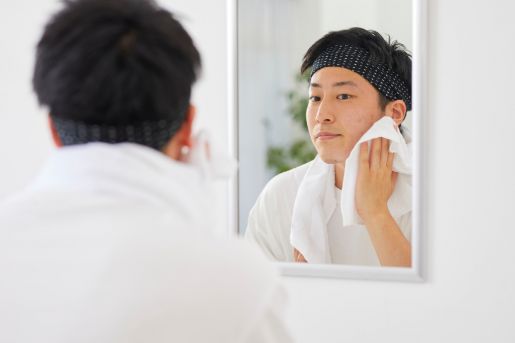 洗顔の際は、ぬるま湯で顔を濡らし、洗顔料をしっかりと泡立ててから、やさしく円を描くように洗います。強くこすりすぎると肌を傷つける可能性があるため、泡のクッションで汚れを浮かせるイメージで行いましょう。洗顔後は、清潔なタオルで水分を優しく押さえるように拭き取ります。